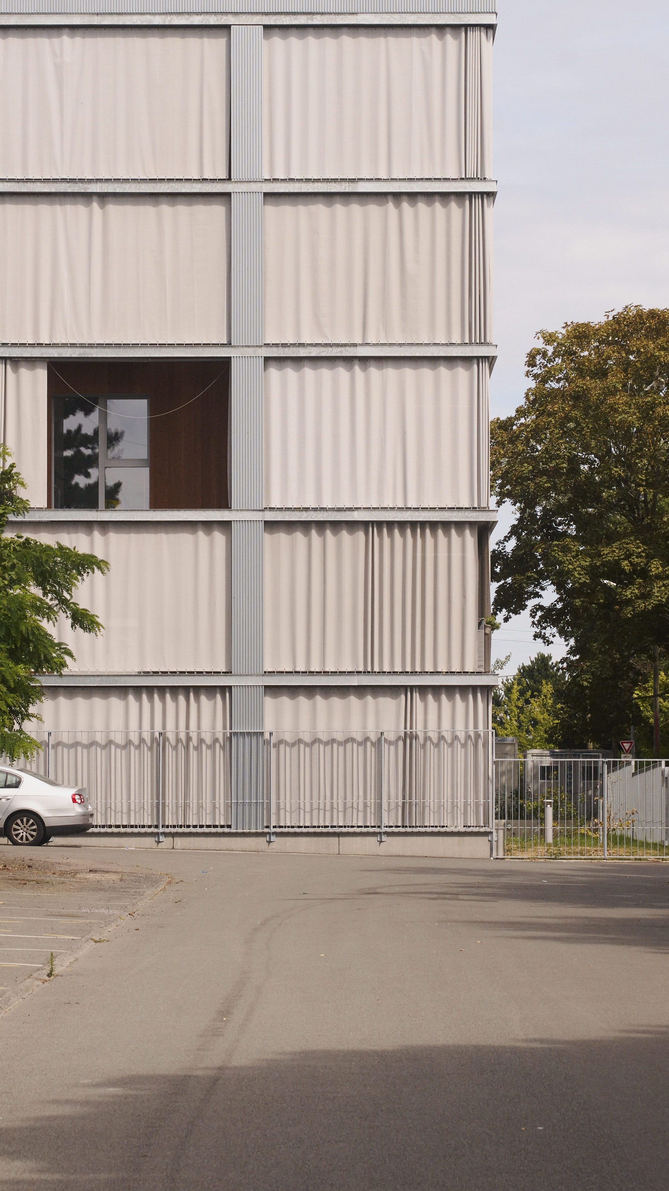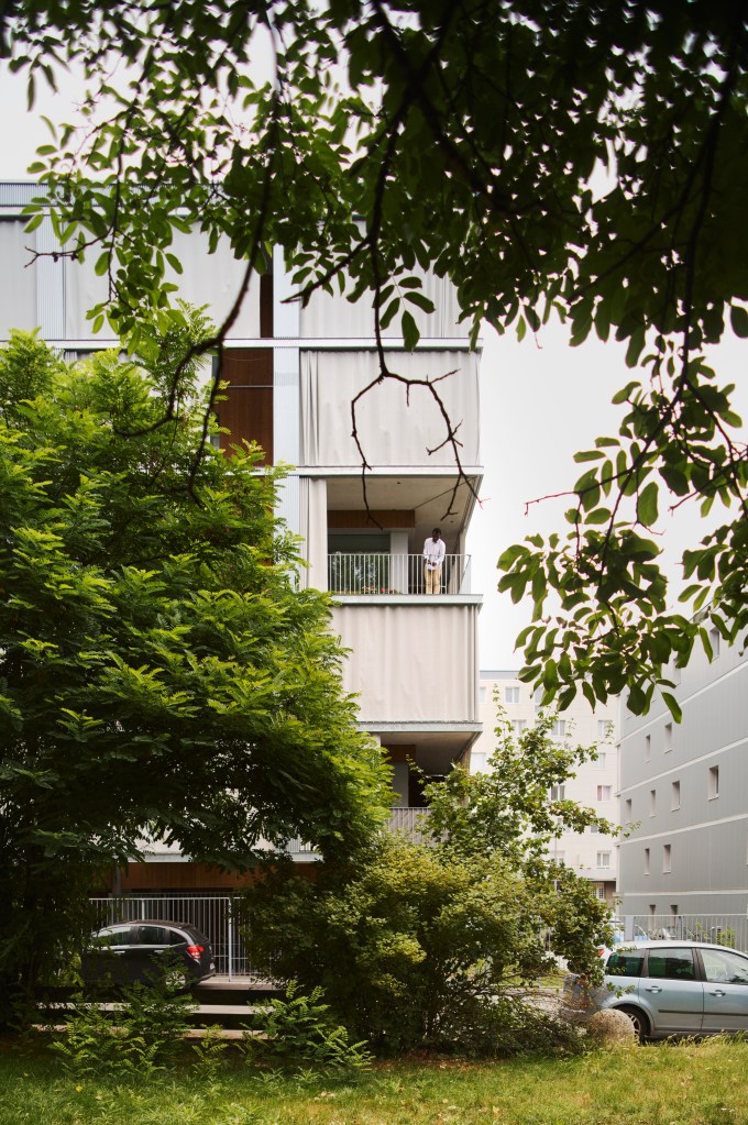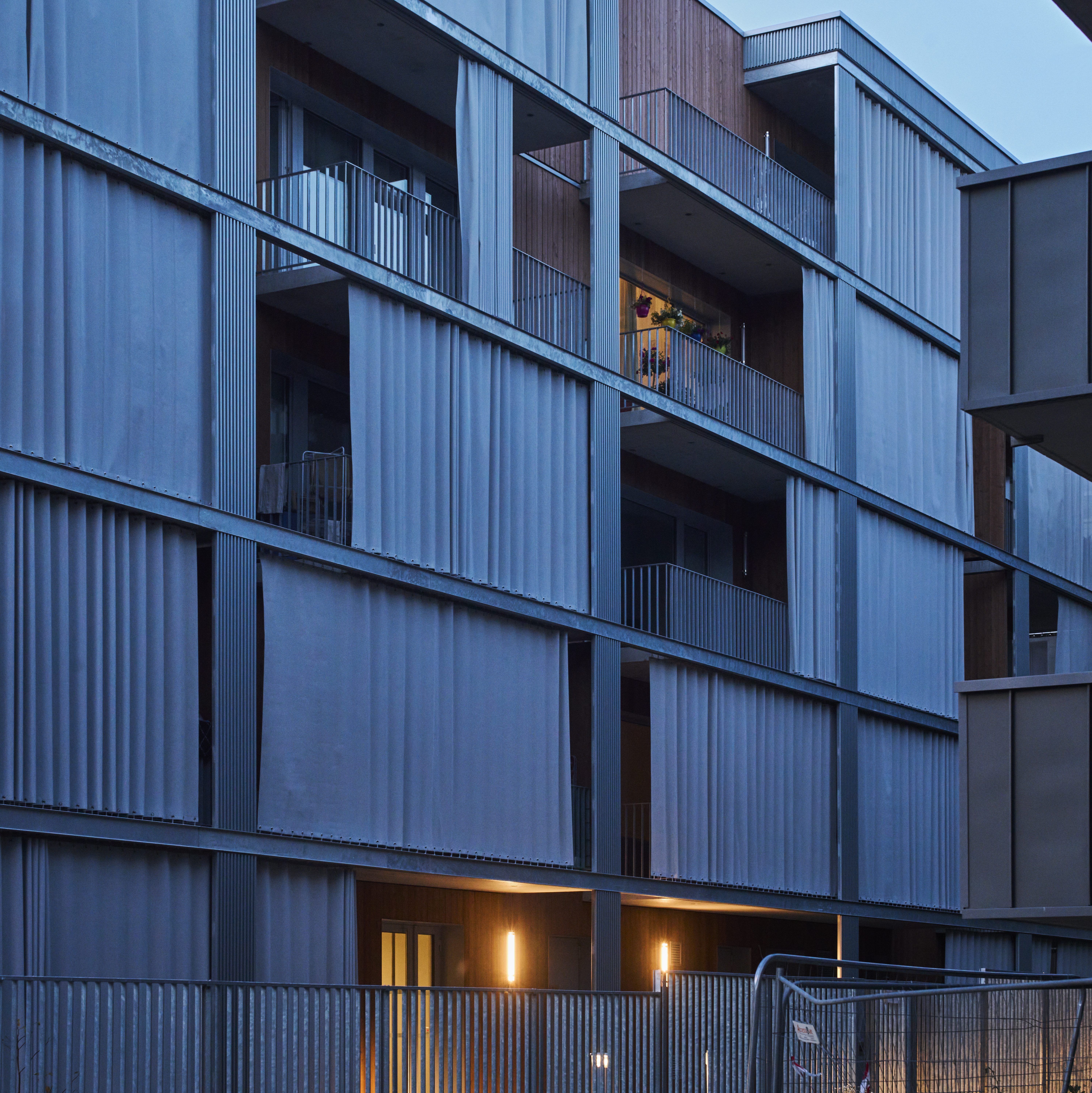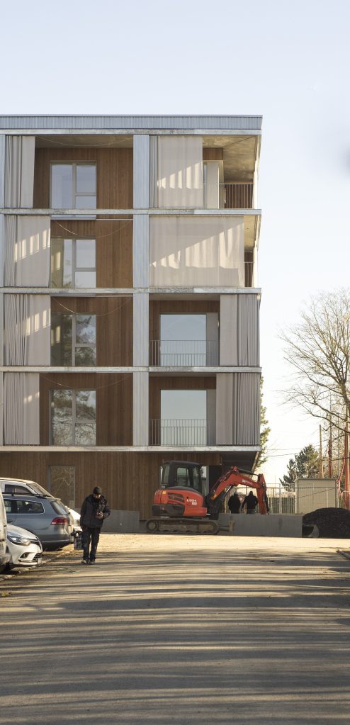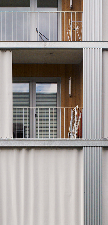 La façade est conçue comme un espace intermédiaire entre le dedans et le dehors. Elle fait office de filtre, pour les vues et la lumière et empêche les surchauffes en été. Constituée par des rideaux extérieurs coulissants, elle ne sera jamais la même en fonctions des envies et des besoins des habitants. Les terrasses deviennent donc une extension du dedans, une véritable pièce en plus lorsqu’il fait beau.