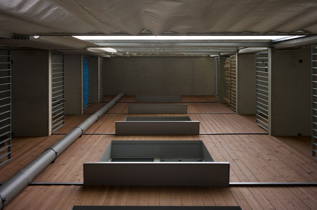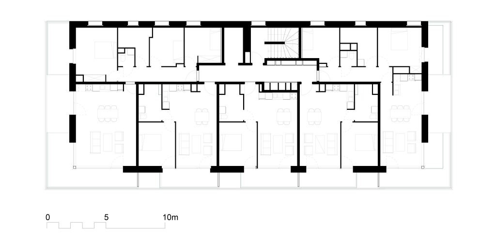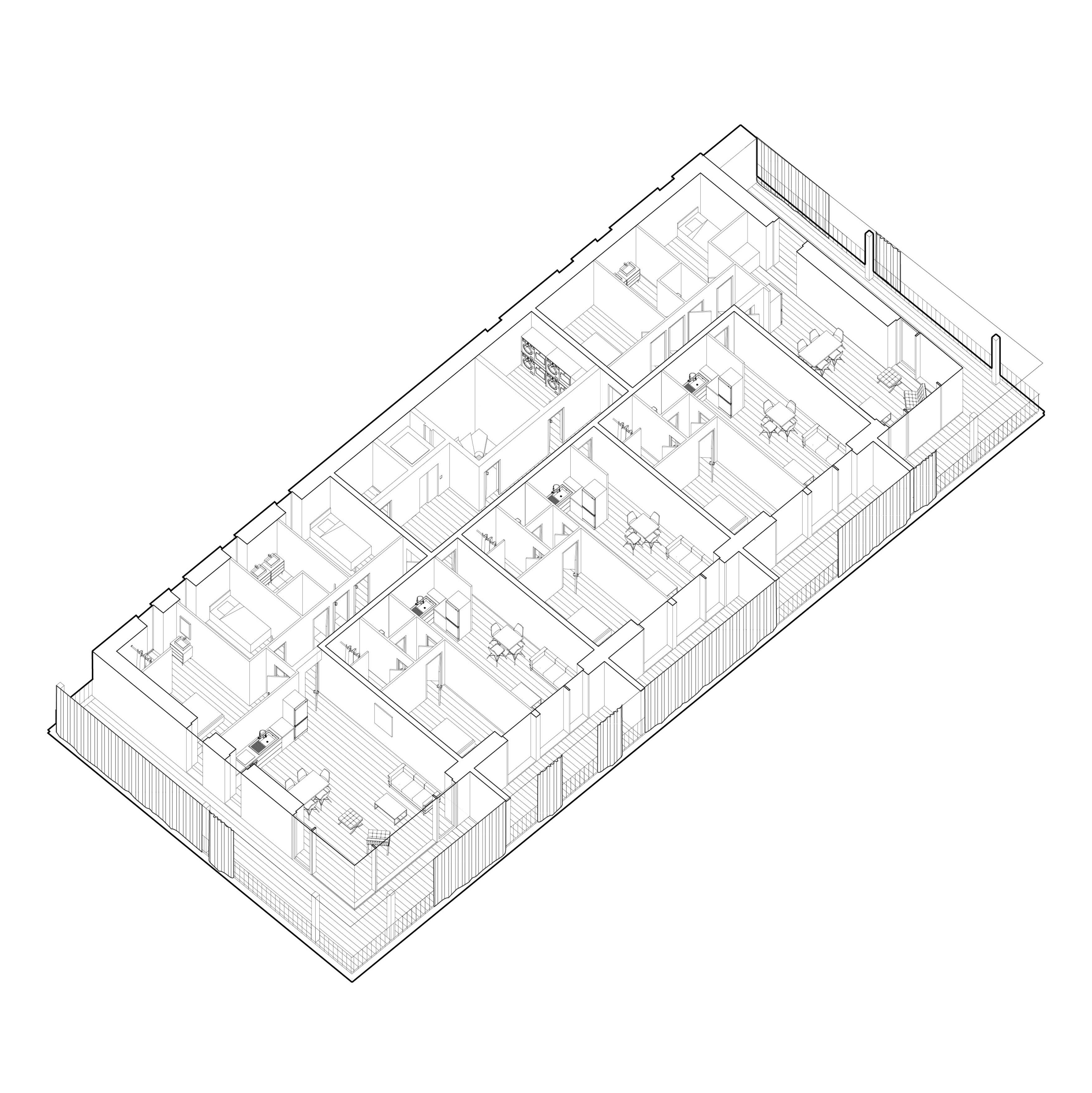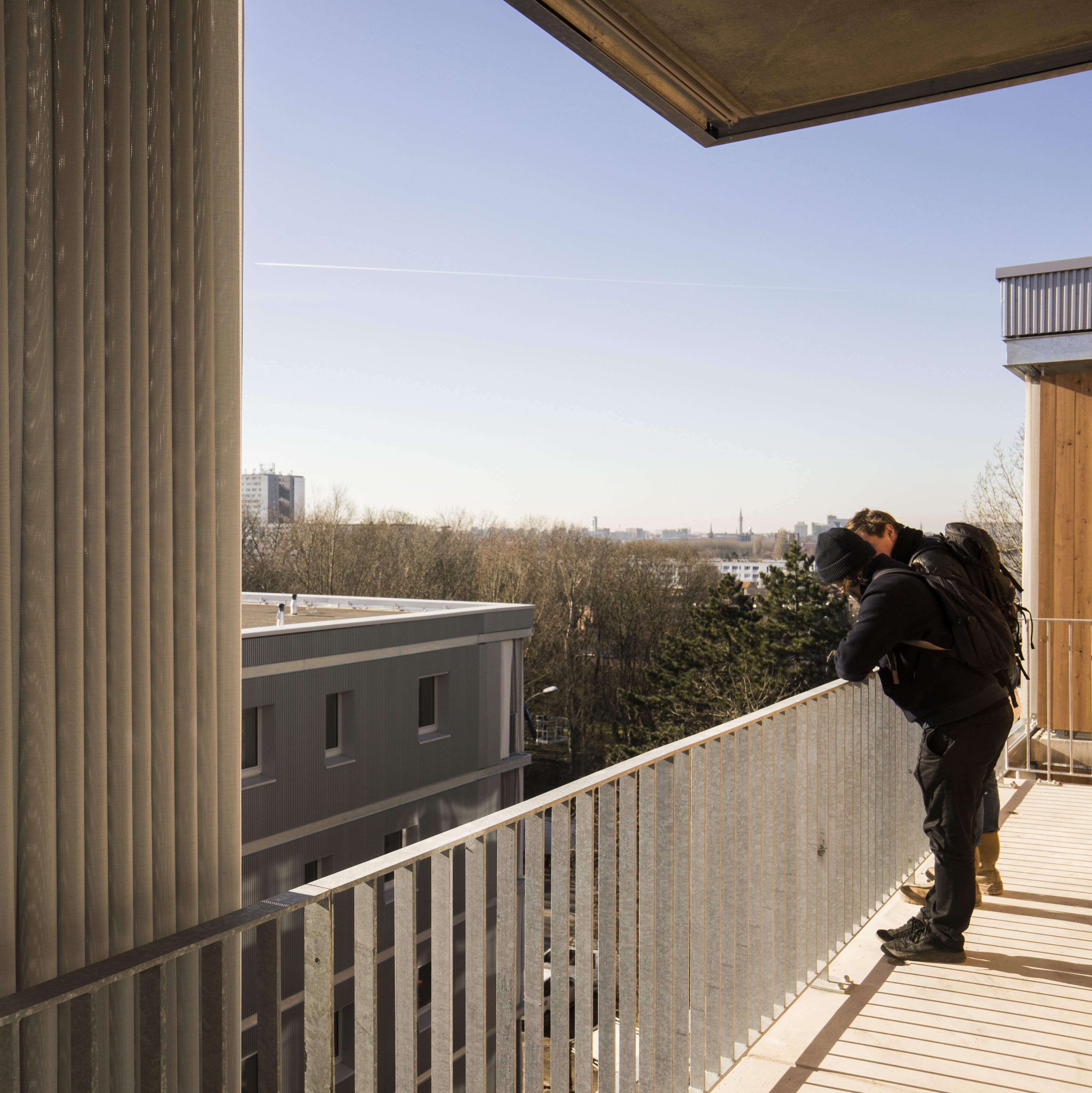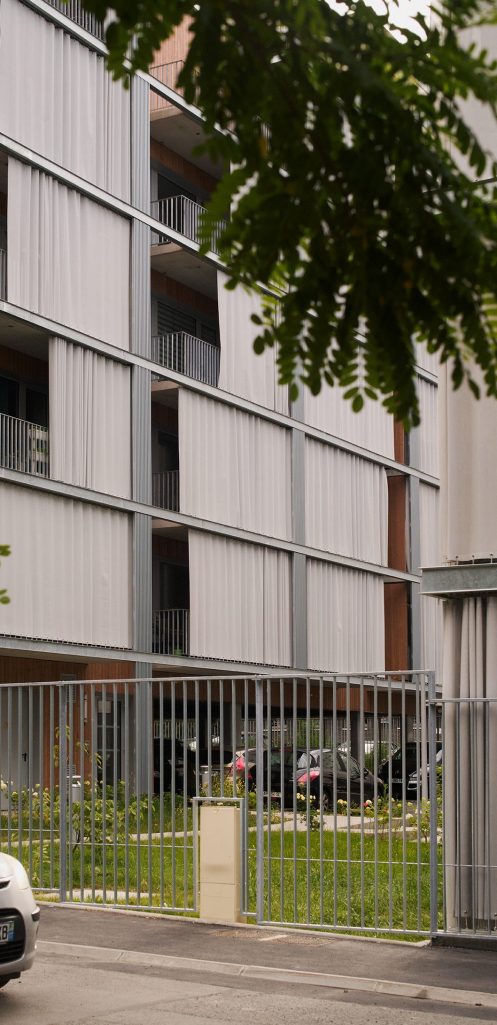 La façade est conçue comme un espace intermédiaire entre le dedans et le dehors. Elle fait office de filtre, pour les vues et la lumière et empêche les surchauffes en été. Constituée par des rideaux extérieurs coulissants, elle ne sera jamais la même en fonctions des envies et des besoins des habitants. Les terrasses deviennent donc une extension du dedans, une véritable pièce en plus lorsqu’il fait beau.